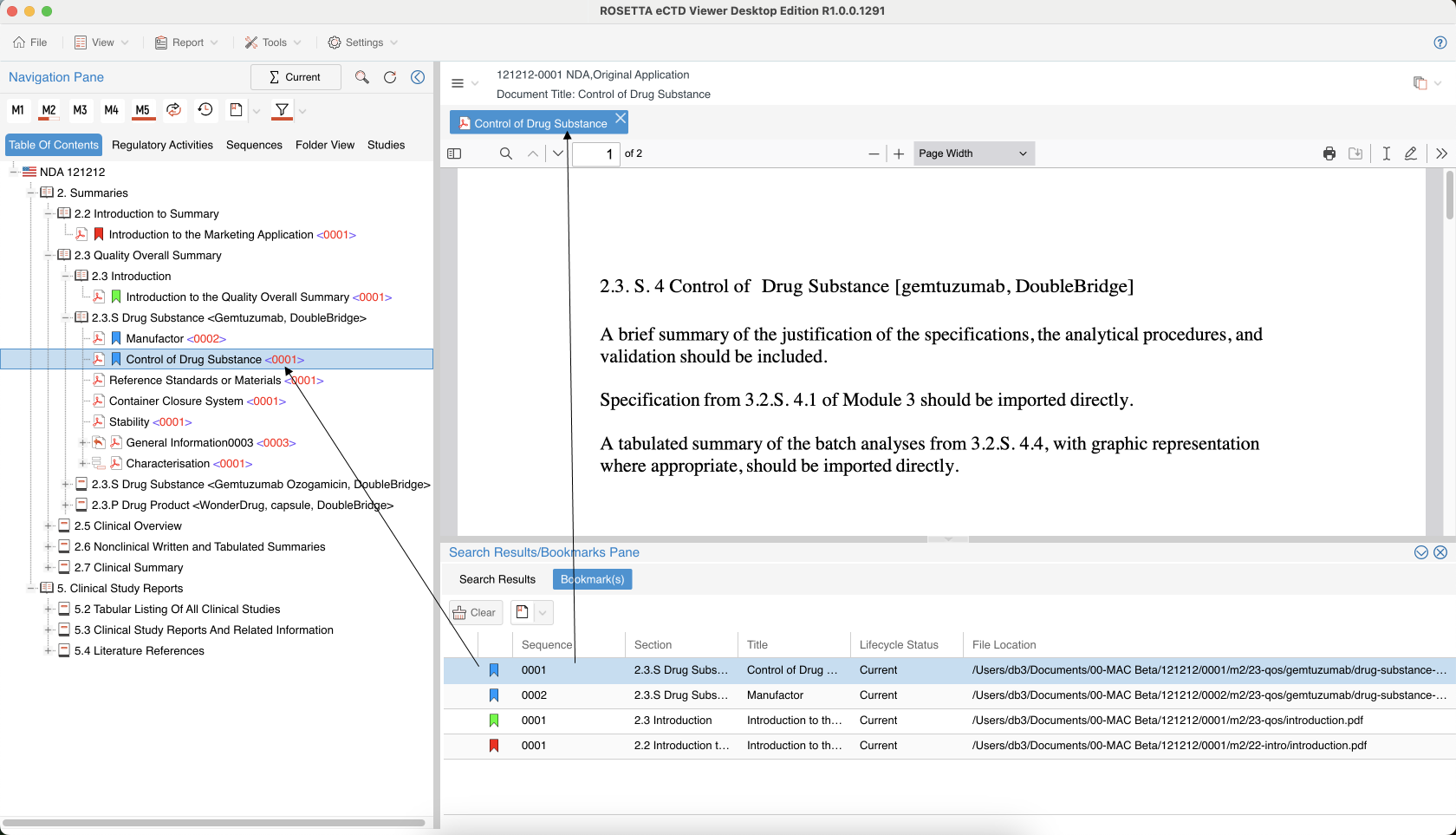 Single click file in the Bookmarks pane can automatically navigate to the document position under Table of Contents and highlight it. Double click file in the Bookmarks pane, the document can be opened in the document viewing pane.