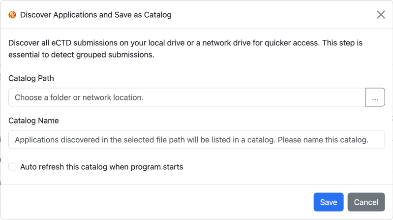 On 'Discover Applications and Save as Catalog' window, Select the folder containing eCTD applications, type the Catalog Name and click OK.