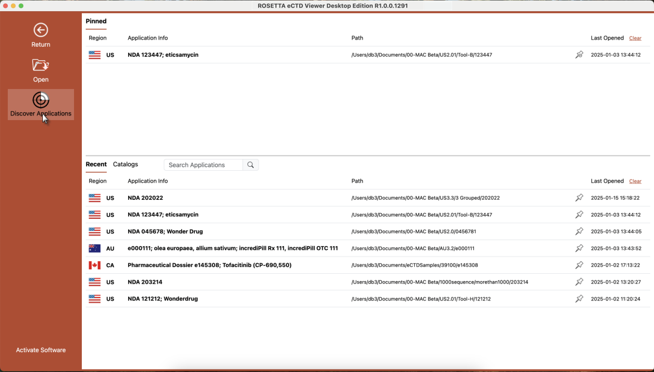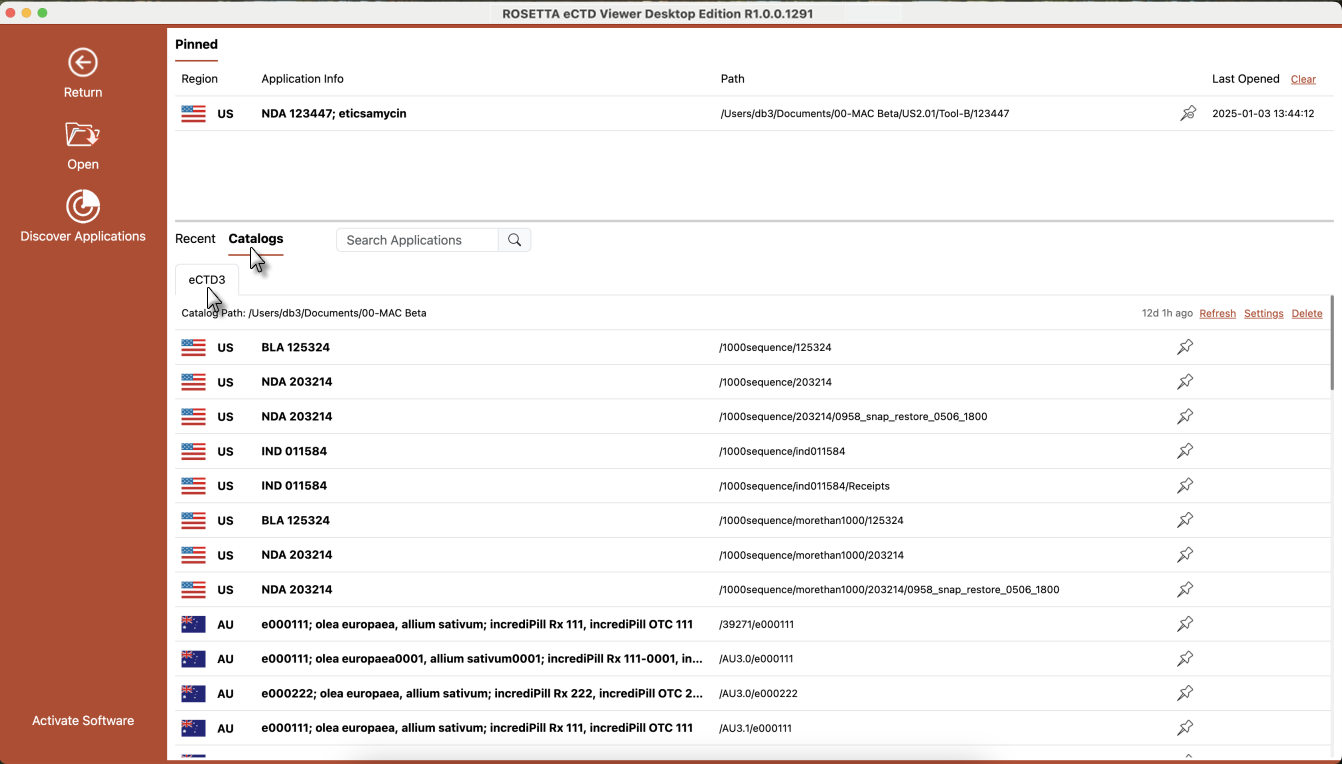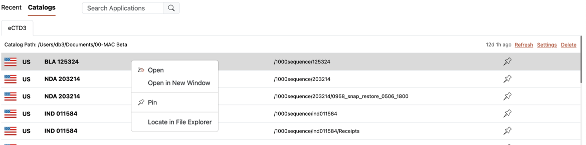 All eCTD applications in this folder will be discovered and listed in the Catalogs panel.