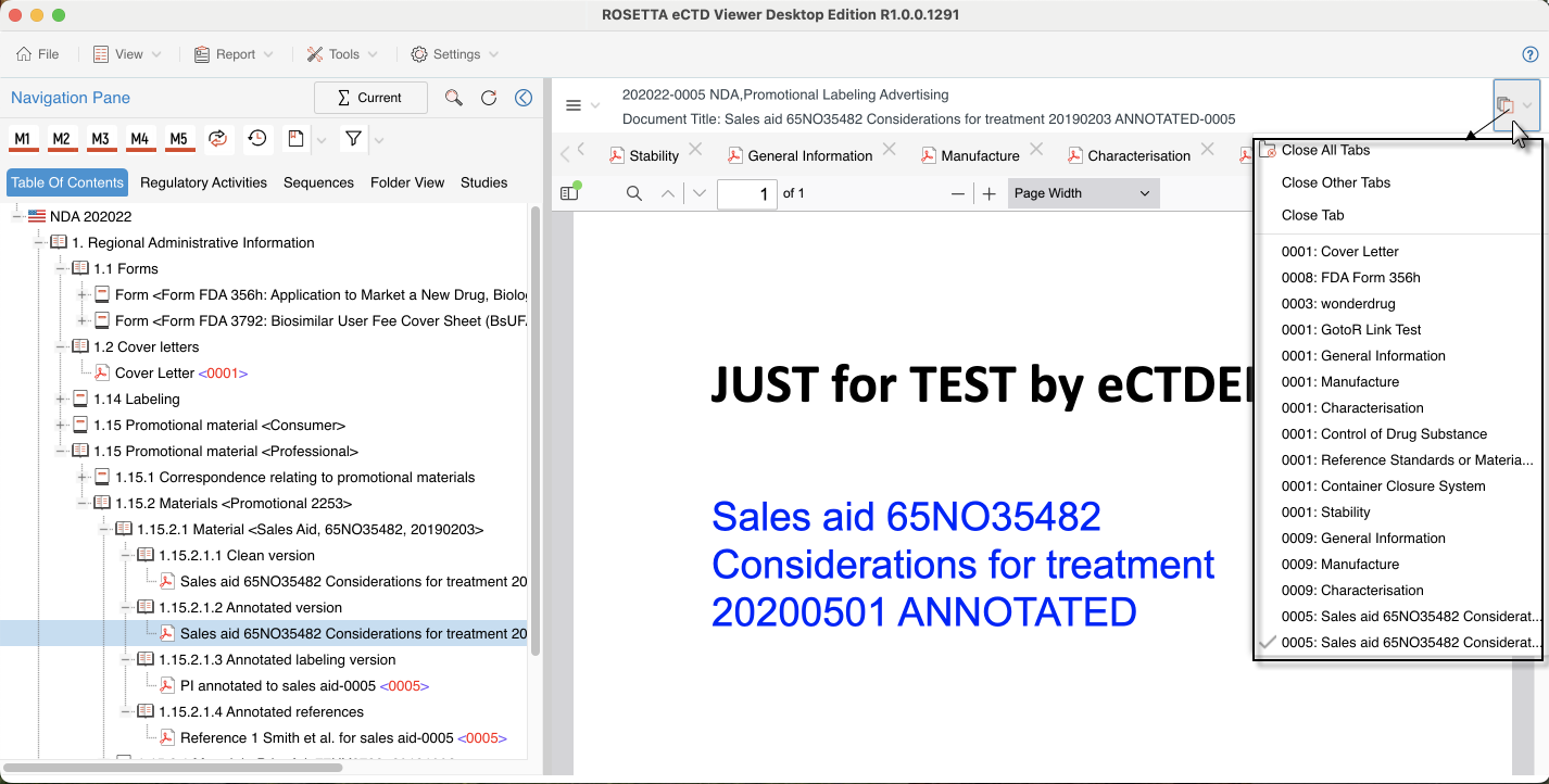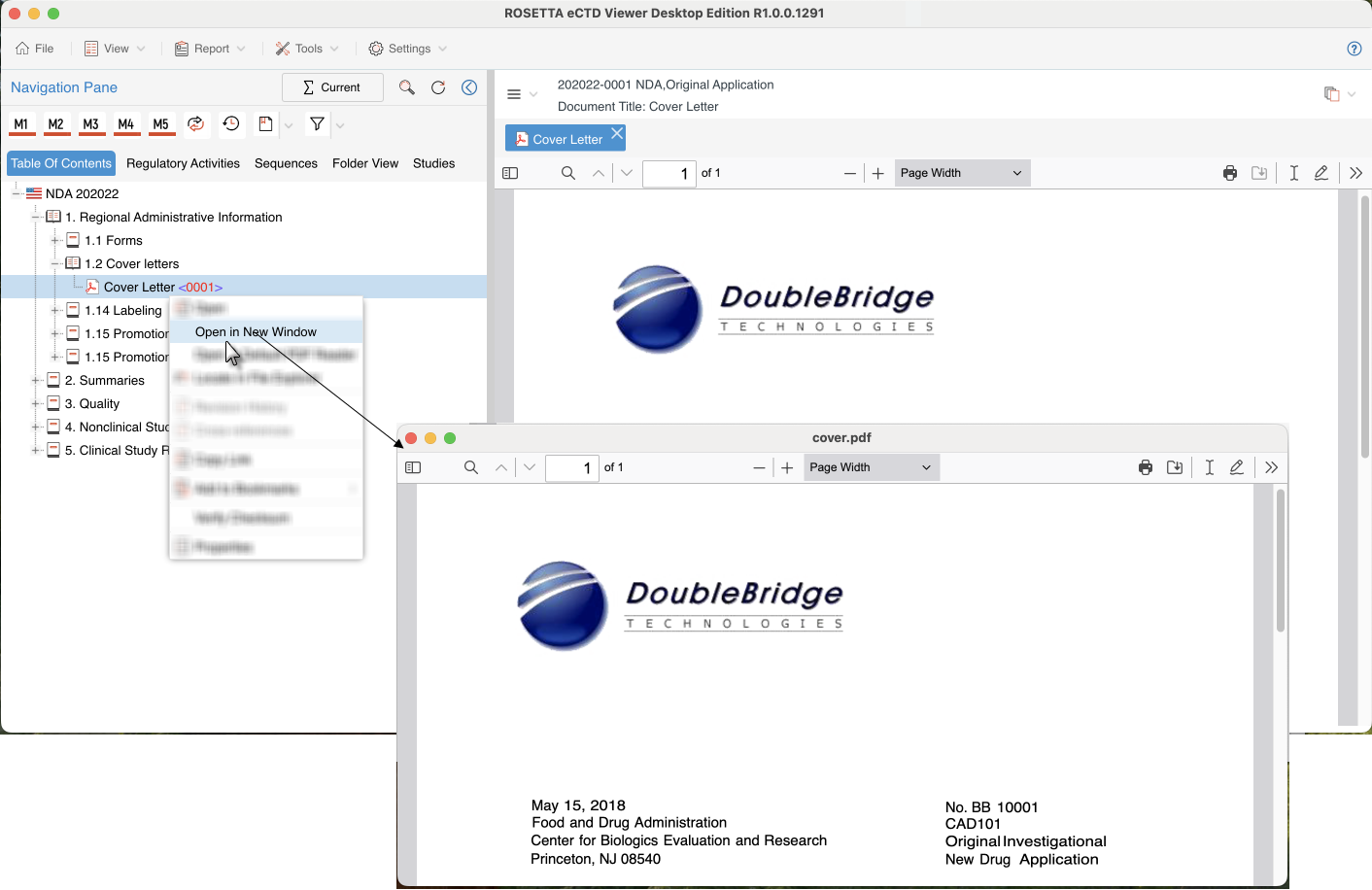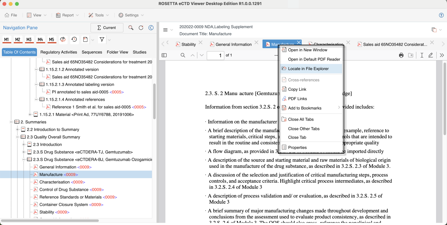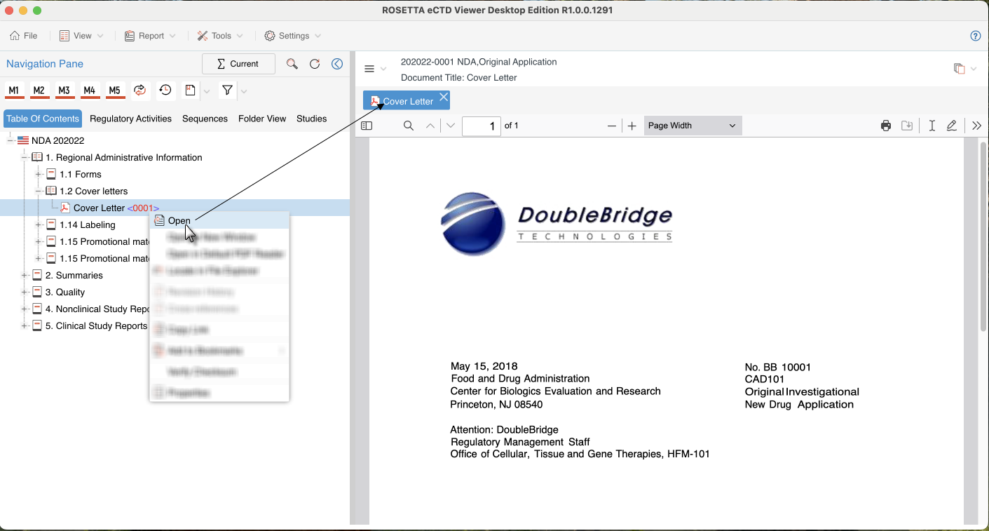 Open eCTD application/sequence in Viewer, On Navigation Pane, under any view, Double Click on the title of a document or select 'Open' from its right-click menu to open the document in a document viewing tab.