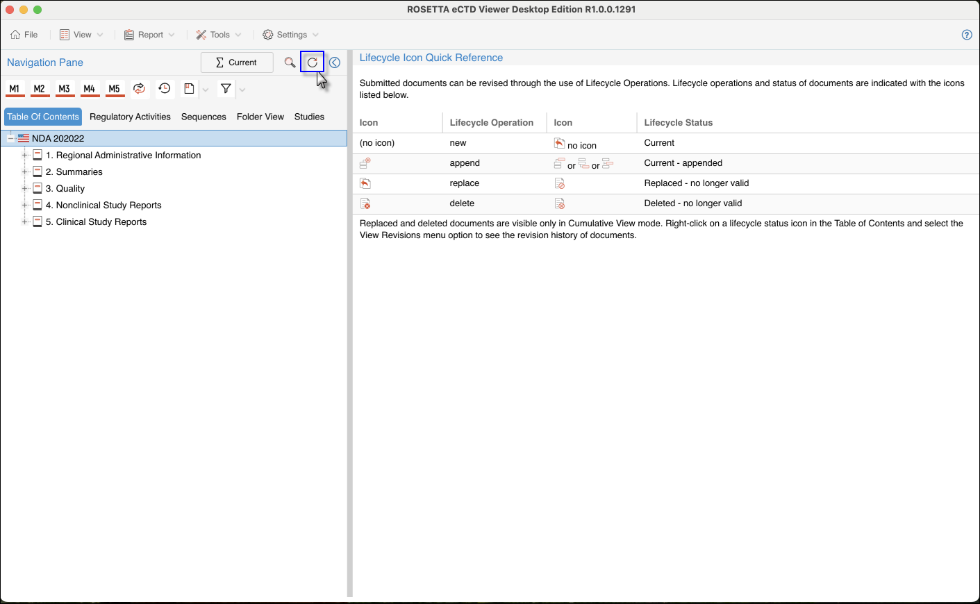 Open eCTD application/sequence in Viewer. If changes are made to the eCTD backbone file, click the "Reload" button in the Navigation Pane to reload the application or submission.