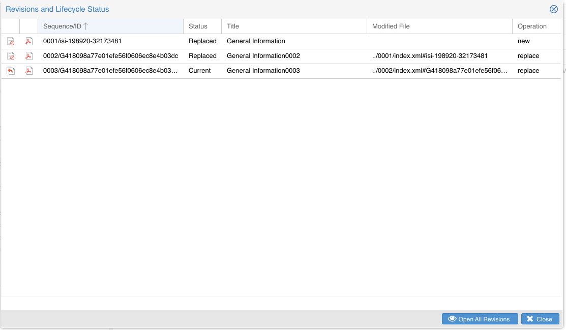 The Revisions and Lifecycle Status window pops up,you can see the details of the lifecycle.