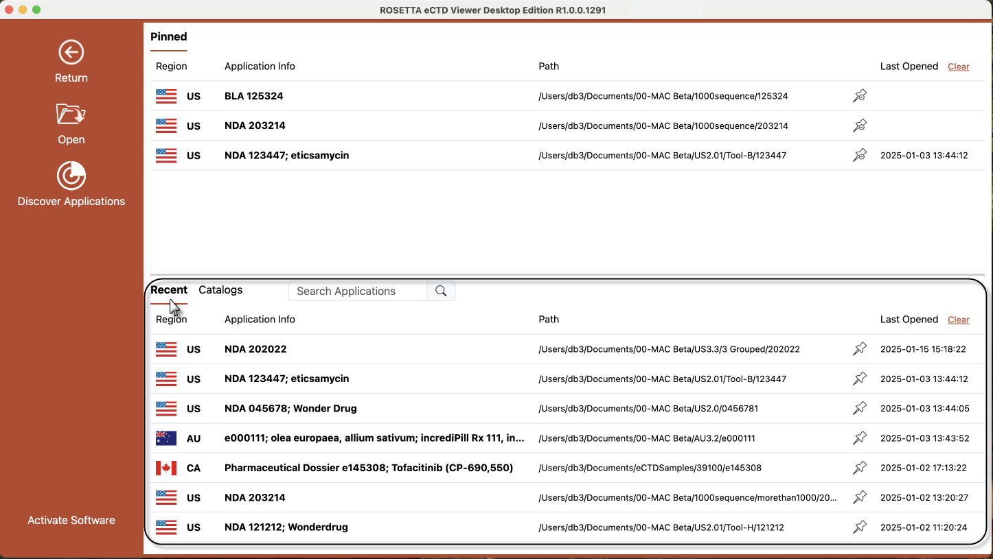Recent Pane locates on the Home Window. It provides the recently opened eCTDs list.