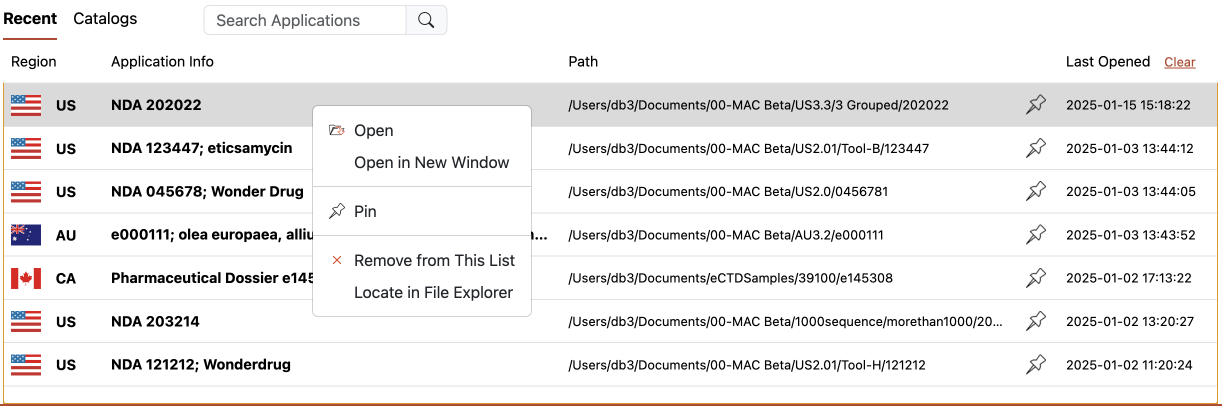 : Type in keywords to search applications from the eCTDs list of Recent pane.