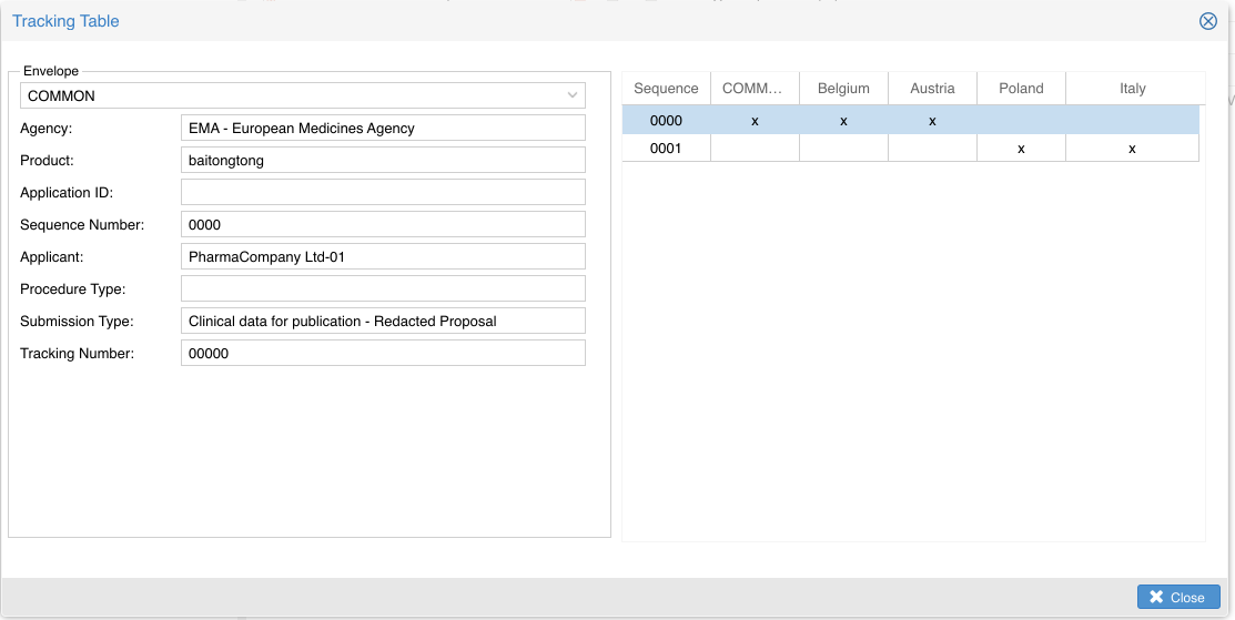 The Tracking Table is a matrix that displays the distribution of sequences to different National Competent Authorities (NCA) in the EU following Mutual Recognition and Decentralized procedures. The Tracking Table displays the application's basic information and Envelope data.