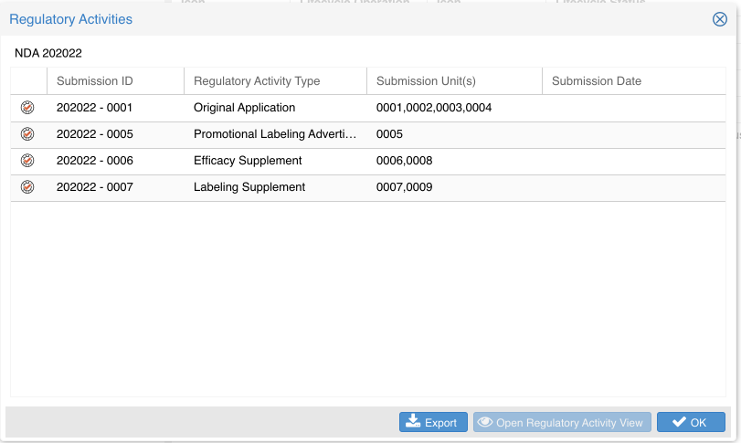 The eCTD Life-Cycle Management is made up of a number of individual regulatory activities. An individual activity is represented by one or more individual eCTD sequences which relate to a particular set of Data Submission or Submission procedure. The Regulatory Activities View is a complex view of all current information relating to a particular set of Data Submissions or Sequences that are linked by the same submission number (with suffix), e.g. - Original Application, Labeling Supplement.