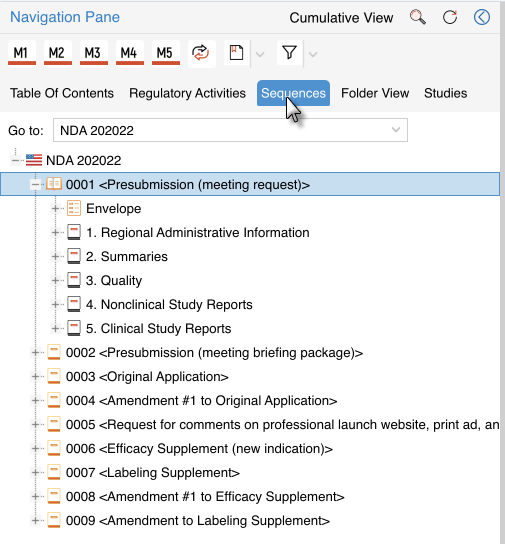 Sequences View displays sequences with their contents respectively, ONLY show cumulative view for eCTD under sequences view.