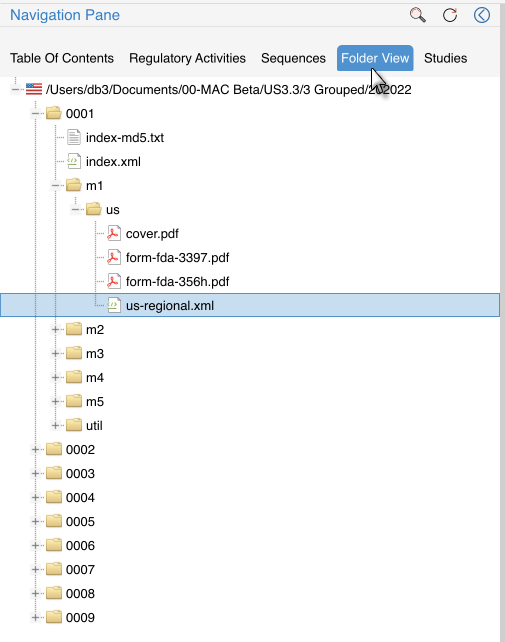 Folder View display the physical structure of the folders and files of the eCTD application/sequence.