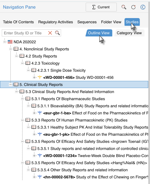 Studies View provides two types of view to display STFs: Outline View and Category View.