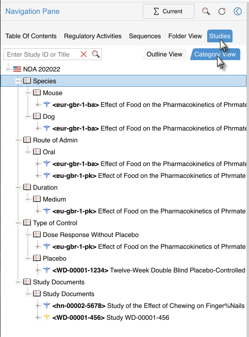 Category View displays STFs by category. All the clinical or non-clinical studies are divided into several categories like species, route-of-admin and type-of-control.